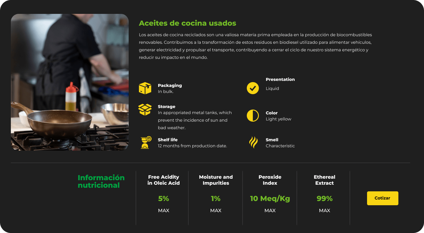 En la vanguardia del sector, nos destacamos como líderes en la producción y distribución de combustibles innovadores. Nuestra especialización radica en la generación de combustibles sostenibles a partir de biomasa, enfocándonos principalmente en aceites de cocina usados y grasas animales premium.