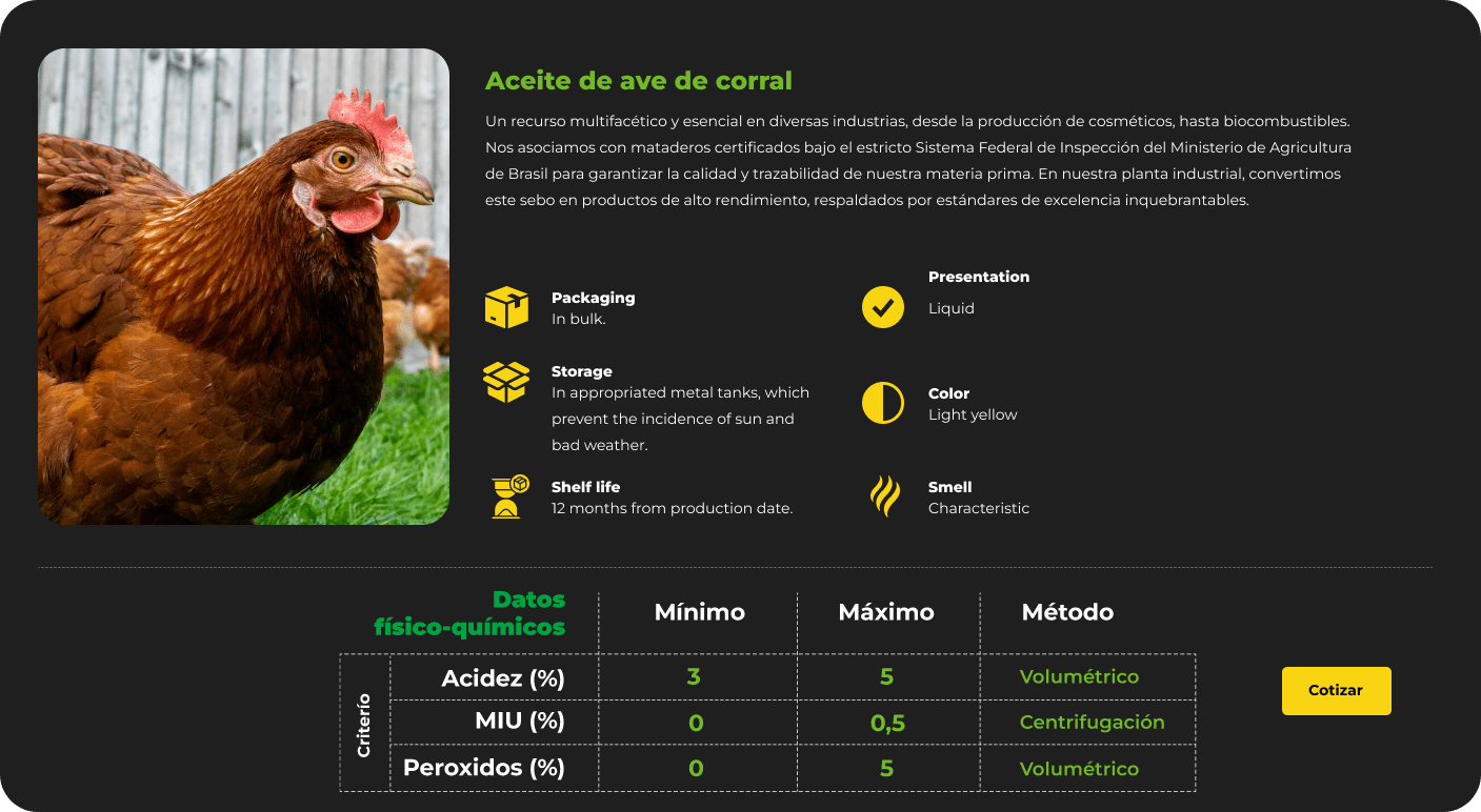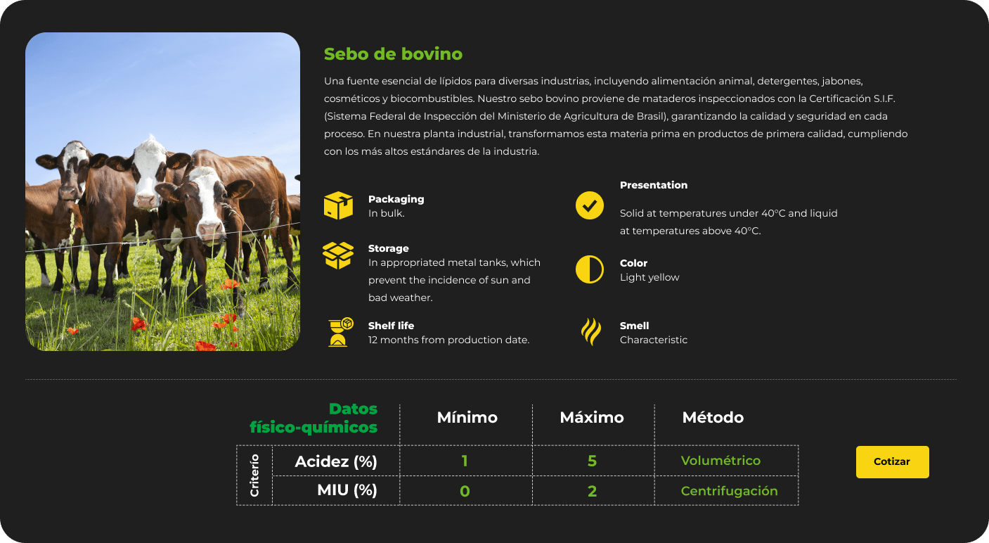 Una fuente esencial de lípidos para diversas industrias, incluyendo alimentación animal, detergentes, jabones, cosméticos y biocombustibles. Nuestro sebo bovino proviene de mataderos inspeccionados con la Certificación S.I.F. (Sistema Federal de Inspección del Ministerio de Agricultura de Brasil), garantizando la calidad y seguridad en cada proceso. En nuestra planta industrial, transformamos esta materia prima en productos de primera calidad, cumpliendo con los más altos estándares de la industria.